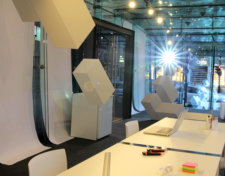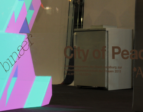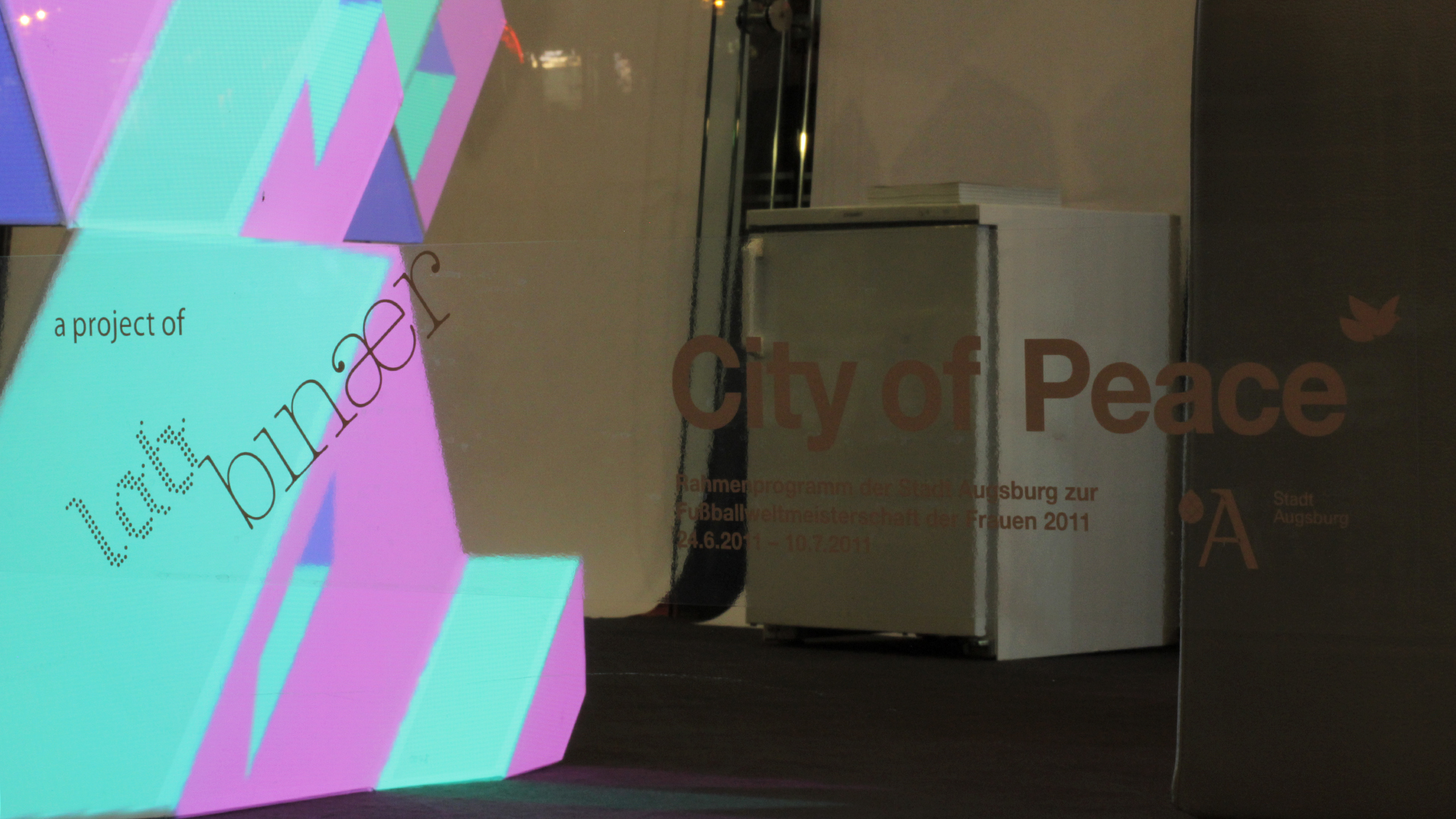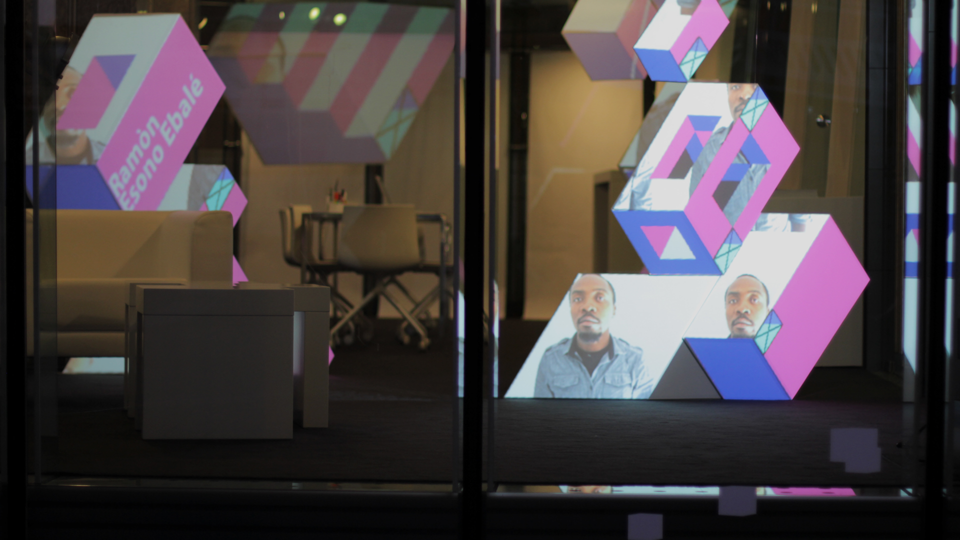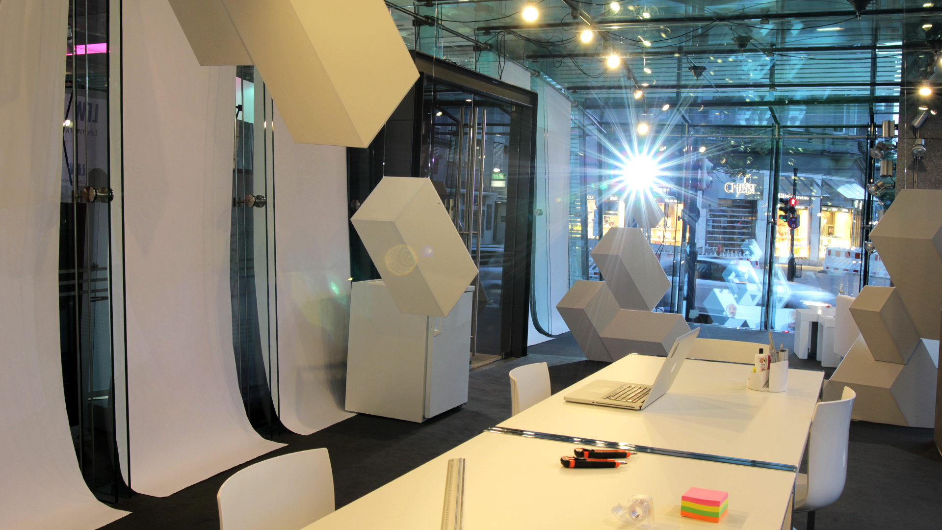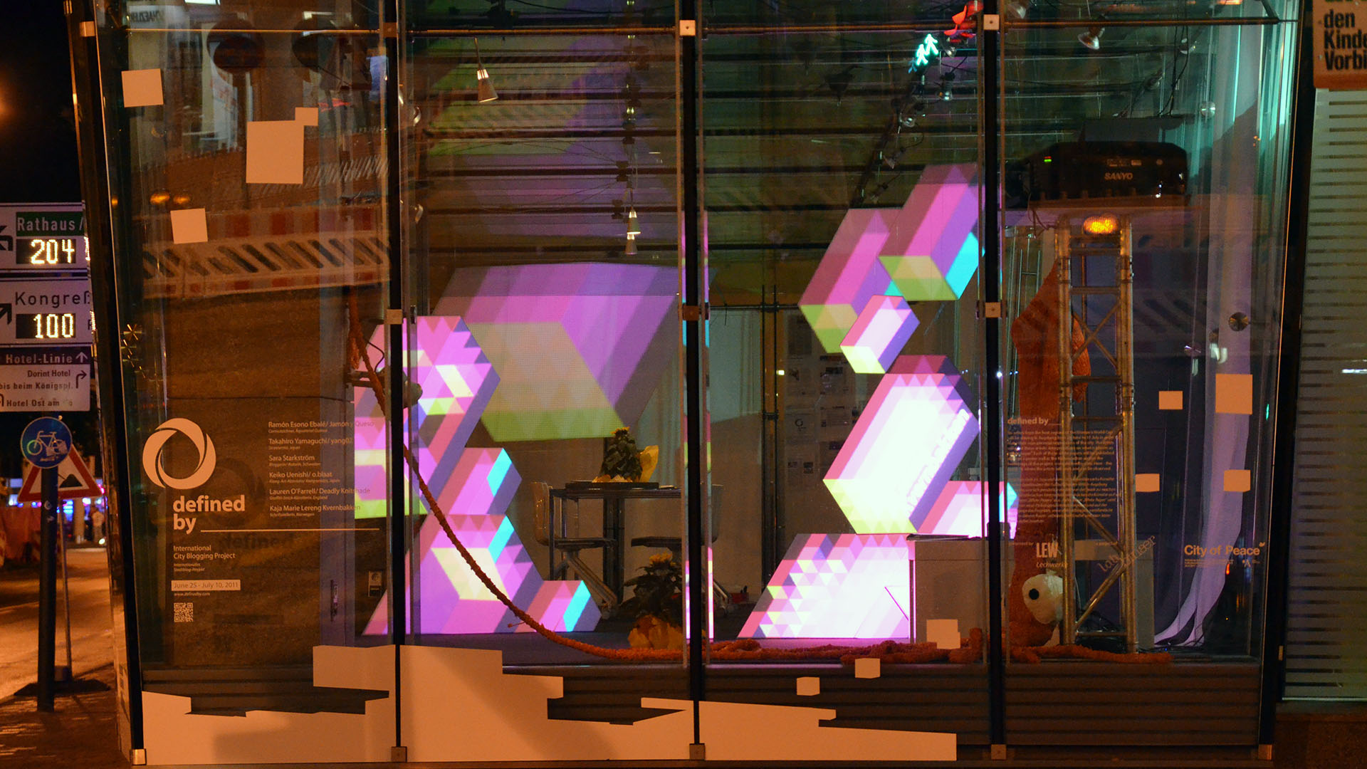 For almost two weeks a prominent glass walled office space in the city center of Augsburg (Germany) was transformed into a studio for international artists. Decorated with all white furniture and futuristic sculptures coming from the floor and ceiling. At night a custom projection mapping flooded the space with colourful light, showcasing the artists work.